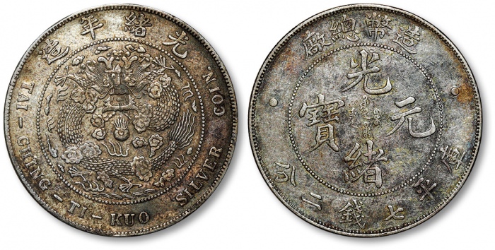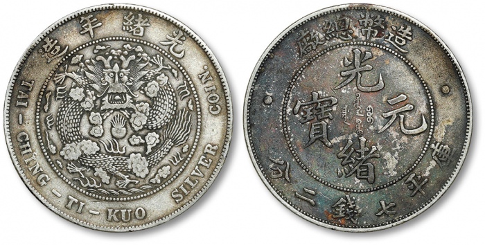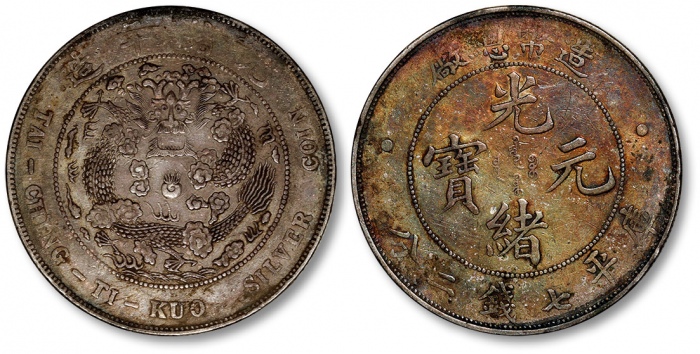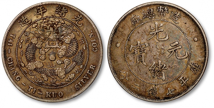 清造币总厂光绪元宝库平七钱二分银币一枚,整体清晰,酱彩包浆,极美品