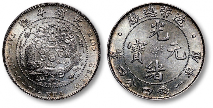 清造币总厂光绪元宝库平一钱四分四厘银币一枚,打制规范清晰,图案文字立体饱满,底版平整,淡金色包浆,底光柔亮,状态上佳,完全未使用品