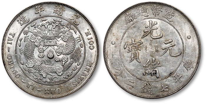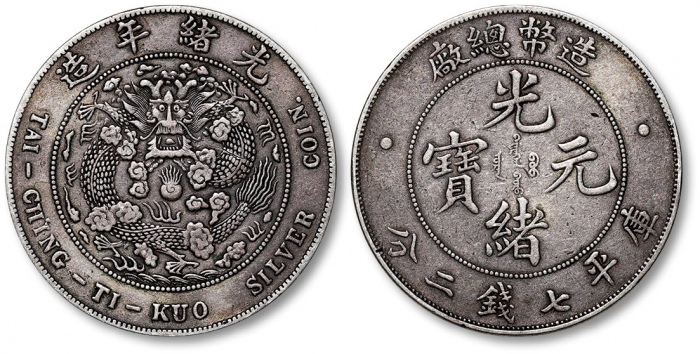 清造币总厂光绪元宝库平七钱二分银币一枚,打制深峻清晰,龙图饱满,原味深色老包浆,味道状态极佳,近未至完全未使用品