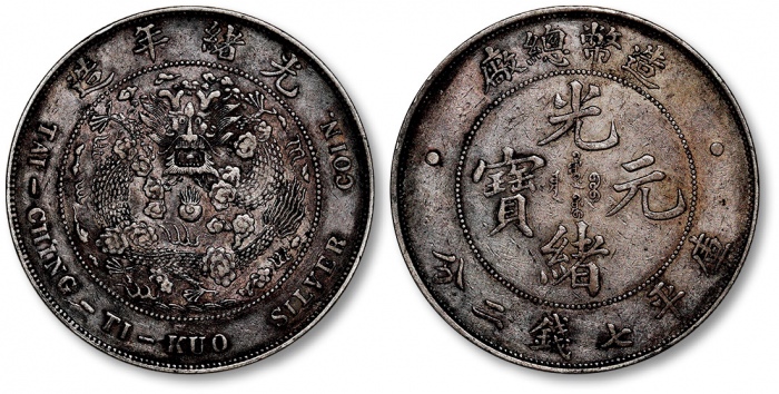 清光绪29年户部光绪元宝库平一钱银币试铸样币一枚,日本大坂造币局制模,北洋银元局试铸,未发行,是清代“圆两之争”时期的产物,存世十分罕见;此样币模具雕刻极尽精美,初铸压力十足,呈镜面版底,龙鳞层叠有致,峭拔深刻,原始闪亮银光,状态完美,是中国机制银币顶级大纲 ...