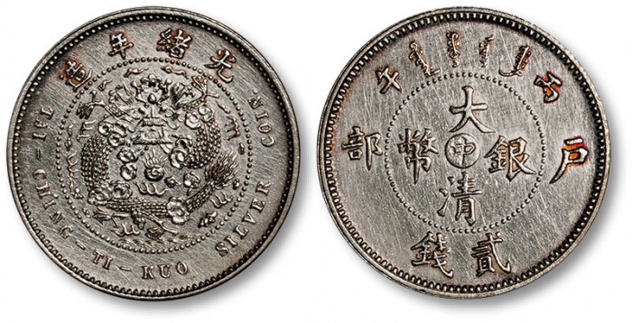 清光绪年造丙午户部大清银币“中”字贰钱样币一枚,户部天津造币总厂试铸,未发行,素为近代机制银币收藏进阶之关键品种;此币铸工极尽精美,打制深峻清晰,图案、马齿边齿凌厉,版底平整细腻,银光亮丽,状态极佳,极为难得,完全未使用品 ...