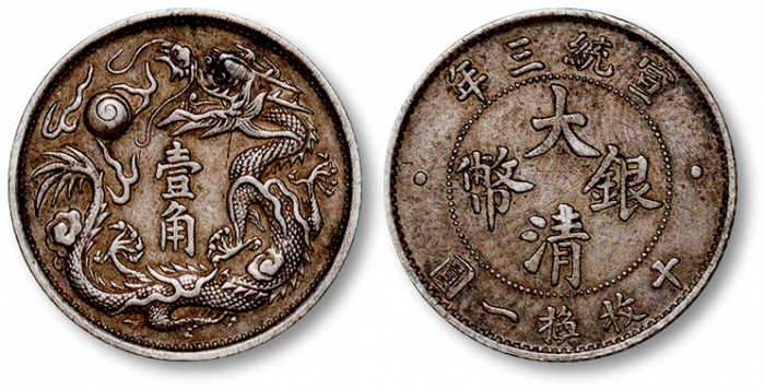 清宣统三年大清银币壹角一枚,打制深峻,图案清晰立体,均匀灰色包浆,状态自然,极美品