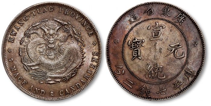 清广东省造宣统元宝库平七钱二分银币一枚,打制规范清晰,龙鳞基本完整,均匀棕色黄油包浆,底光柔亮,状态自然,近未使用品