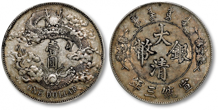 宣统三年大清银币“反龙”版壹圆试铸样币一枚,阳叶版,周沈谱编号:$1 CE.6.2,1911年度支部天津造币总厂试铸,未发行,铸额稀少,向为广大藏家所钟爱;本品模具状态良好,铸打极其出色,压力十足,图案字口均挺拔峻峭,金龙饱满,栩栩如生,云朵飘逸,花枝灵动,浮雕感极强 ...