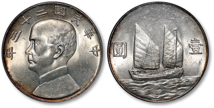 民国二十三年孙中山像背帆船壹圆银币一枚,打制规范利落,图案立体挺拔,浮雕感强烈,镜面底版,铸纹清晰,银光霜白闪亮,状态极佳,十分难得,金盾PCGS AU58(40480222)