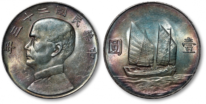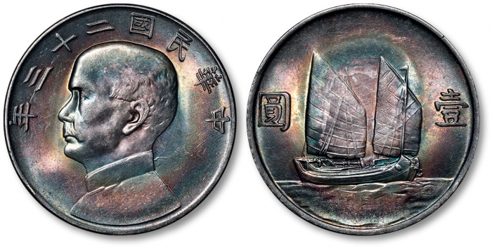 民国二十三年孙中山像背帆船壹圆银币一枚,打制清晰完美,五彩包浆车轮底光,氧化包浆色彩浓烈,如落日之晚霞,光泽悦目,状态极佳,完全未使用品