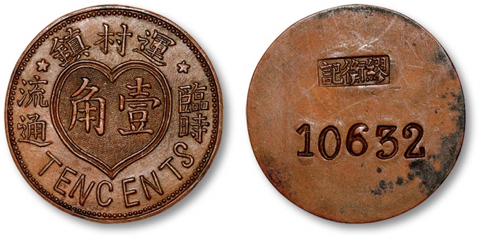 民国十七年军工工友消费证壹分铜元一枚,此币打制有趣,一面阴打,或为铸造错误,十分少见,极美品