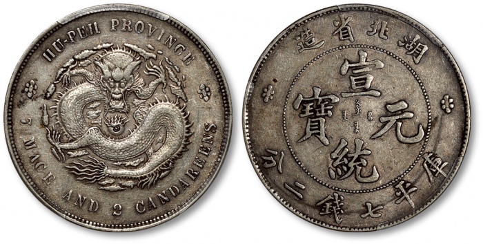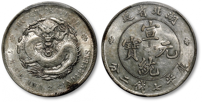 清湖北省造宣统元宝库平七钱二分银币一枚,火珠阳旋,打制规范,图案立体清晰,原色旋转闪亮银光,金盾PCGS AU53(45004008)