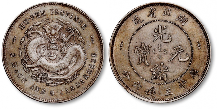 清湖北省造光绪元宝库平三钱六分银币一枚,打制规范深峻,压力十足,图案文字清晰饱满,底版平整,灰色包浆,状态自然,极美至近未使用品
