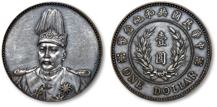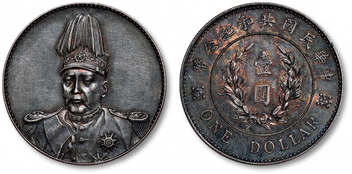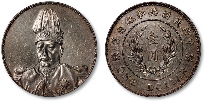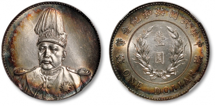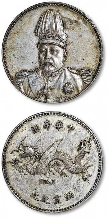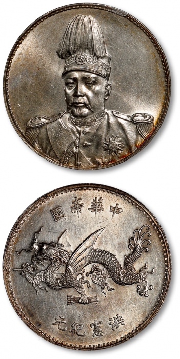 1916年袁世凯戎装像背飞龙中华帝国洪宪纪元纪念银币一枚,人像铸模深峻清晰,生动传神,打制十分精美,底版平整光洁,原味淡灰色带五彩包浆,状态品相一流,十分难得,金盾PCGS MS65(26723486) ...