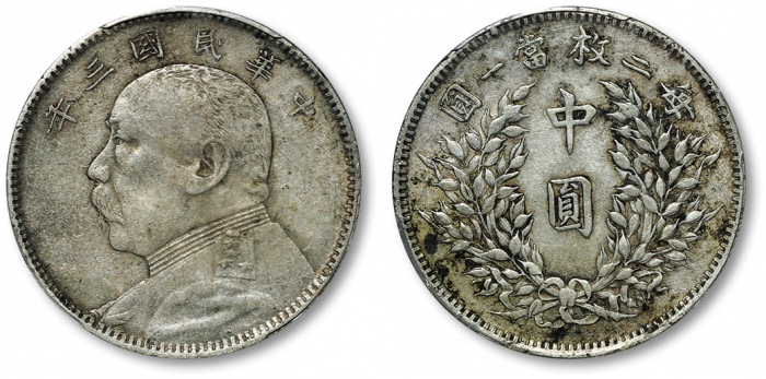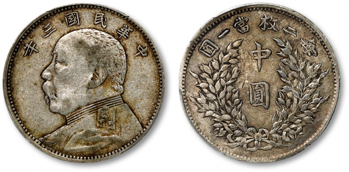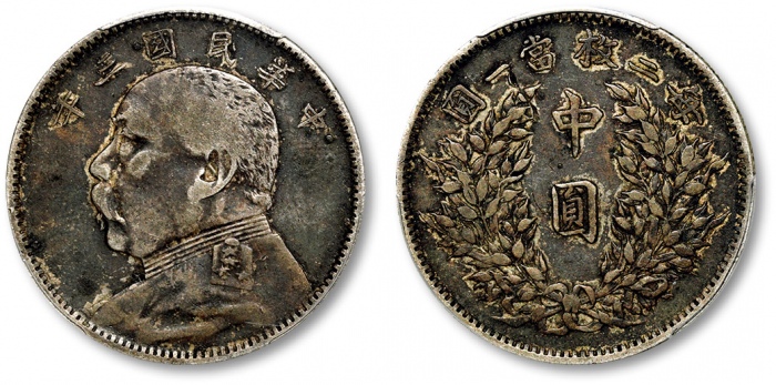 民国三年袁世凯像中圆银币一枚,打制规范,灰色老包浆,银光亮泽,海外资深藏家出品,金盾PCGS XF Detail(43994364)