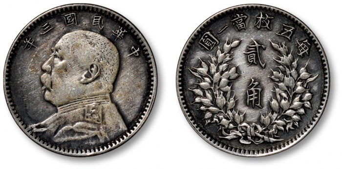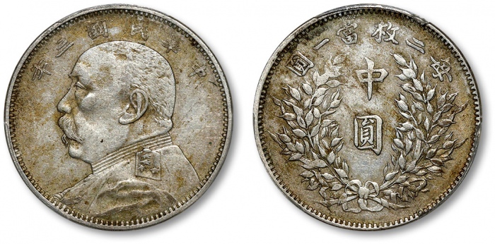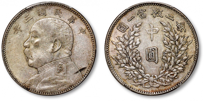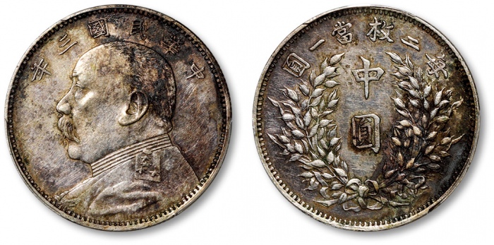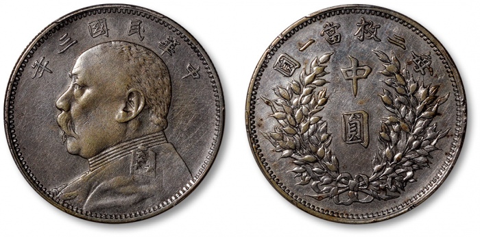 民国三年袁世凯像壹角银币一枚,此币打制压力十足,人像文字立体挺拔,线条清晰犀利,版底光滑有些许镜面感,原色闪亮银光,一流品相状态,PCGS MS66(13589079),为此公司此品种第二名分数且高于此分数仅四枚 ...