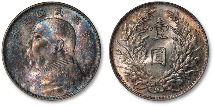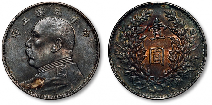 民国三年袁世凯像壹圆银币一枚,打制规范清晰,深五彩包浆,旋转底光,光泽柔亮,完全未使用品