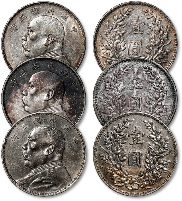 民国三年袁世凯像壹圆银币共三枚,打制规范清晰,深酱彩及淡金色包浆,带底光,分别为金盾PCGS VF Detail、XF Detail、AU50(87564457、87564465、87564421)