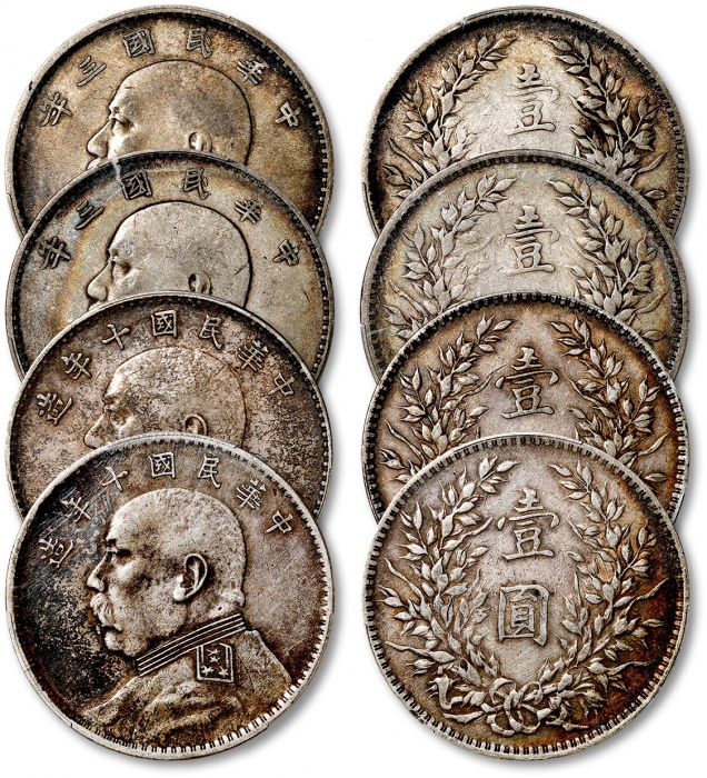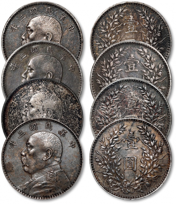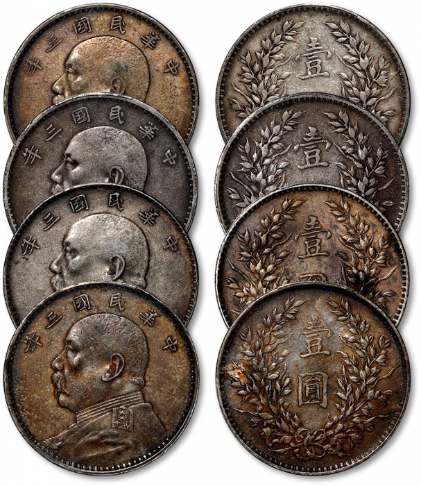 民国三年袁世凯像壹圆银币共四枚,打制规范,原味酱彩及灰色包浆,状态自然,分别为金盾PCGS VF35、XF40、XF45(87564384、87564414、87564461、87564397)