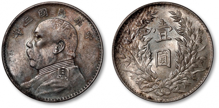 民国三年袁世凯像壹圆银币一枚,打制规范清晰,淡灰色包浆,柔滑旋转底光,状态自然,完全未使用品