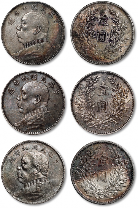民国九年袁世凯像壹圆银币二枚、十年袁世凯像壹圆银币一枚,共计三枚,整体清晰,厚重深酱彩老包浆,海外回流,均为金盾PCGS XF Detail(87564582、87564579、87564603)