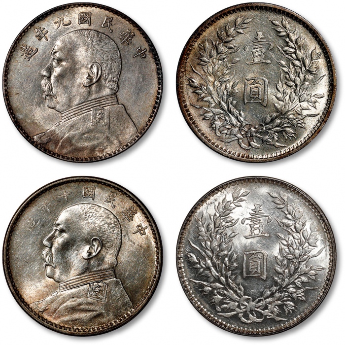 民国九年、十年袁世凯像壹圆银币共二枚,打制规范清晰,底版平整,淡金色包浆,旋转底光,海外回流,近未使用品