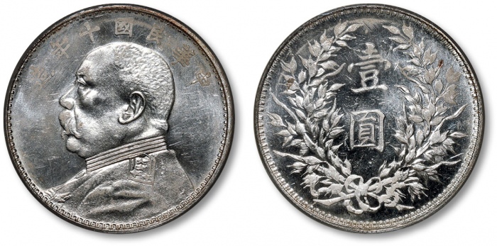 民国九年袁世凯像壹圆银币一枚,云南版,打制规范清晰,深灰色酱彩包浆,底光旋转,丝滑柔亮,状态上佳,金盾PCGS MS63(41239672)