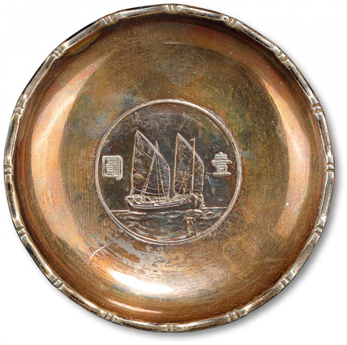 镶民国二十二年船洋壹圆银币刻竹枝纹椭圆银盘一件,直径:114毫米,重量:69.25克,背面镌有“NANKIN”、“顺昌”款,造型优美,品相完好