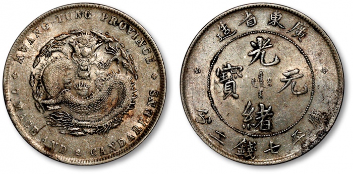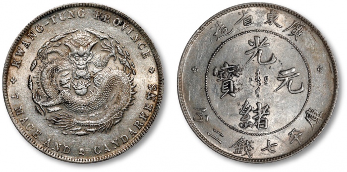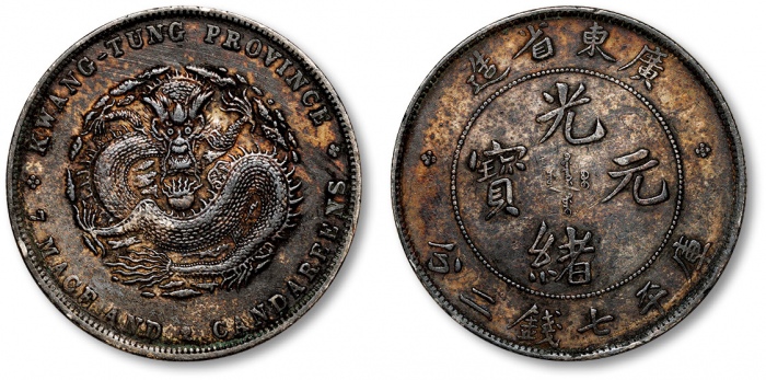 清广东省造光绪元宝库平七钱二分银币一枚,打制深峻规范,图案文字立体饱满,醇厚深酱彩浆,状态上佳,近未至完全未使用品