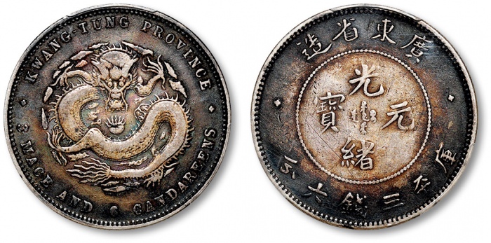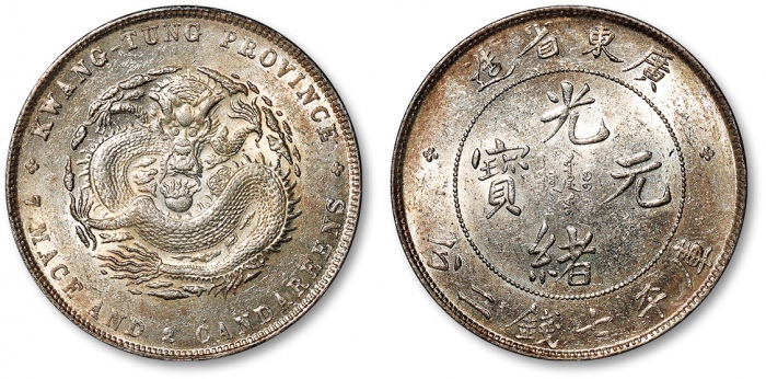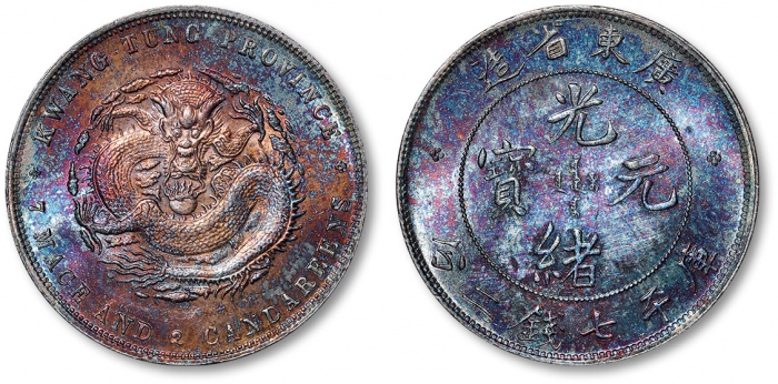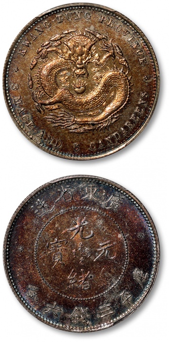 清广东省造光绪元宝库平一钱四分六厘试铸样币一枚,此币又称“广东七三反版”,英国伯明翰喜敦造币厂制模,广东钱局铸造,中国近代机制银币开山之作,是近代机制银币的著名珍品,此品打制清晰深刻,图案精美,龙图呼之欲出,压力十足,五彩原味包浆带底光,状态顶级,无与伦比 ...