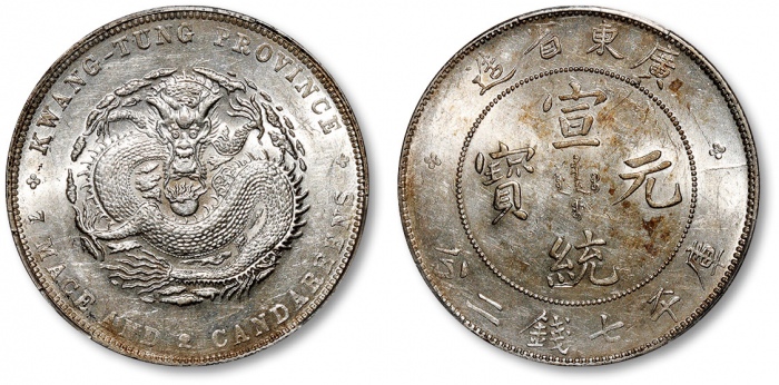 清广东省造宣统元宝库平七钱二分银币一枚,打制十分规范,龙图立体饱满,底版十分平整,原色旋转闪亮银光,状态上佳,金盾PCGS AU58(88376020)