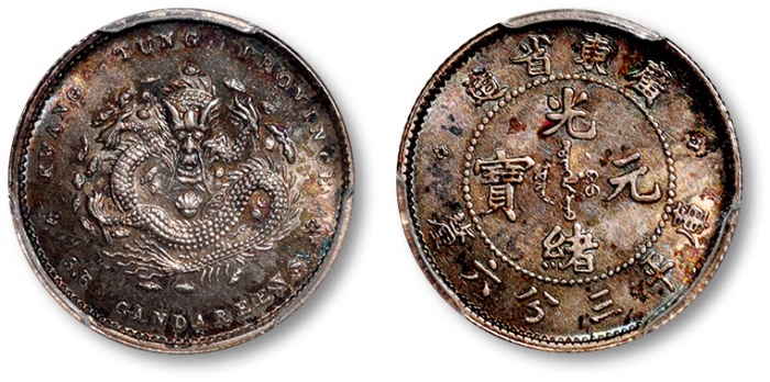 清广东省造光绪元宝库平三分六厘银币一枚,此币打制深峻利落,币边高挺,压力十足,图案文字饱满清晰,龙鳞清晰分明,底版平滑,深灰色五彩包浆,底光柔滑,状态上佳,金盾PCGS MS63(88101996) ...