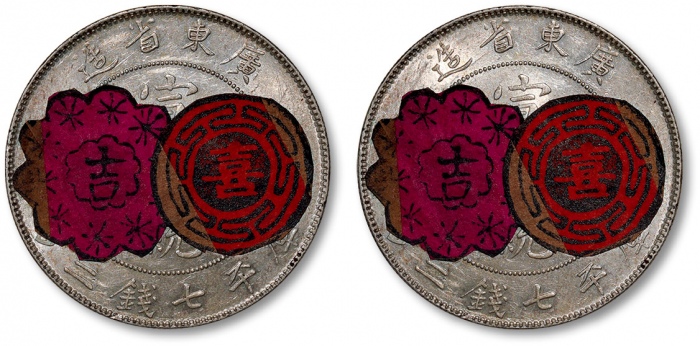 图错,以实物为准。清广东省造宣统元宝库平七钱二分银币一枚,背贴“吉”、“喜”字,打制规范,图案清晰完美,原色车轮十字转光,光泽悦目,状态极佳,完全未使用品