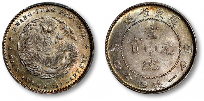 清广东省造宣统元宝库平一钱四分四厘银币一枚,打制规范,图案立体清晰,龙鳞清晰分明,灰色淡五彩老包浆,底光旋转柔滑,状态上佳,金盾PCGS MS64(86532521)