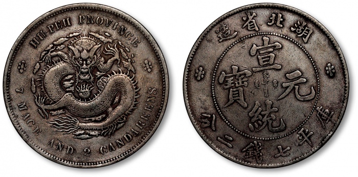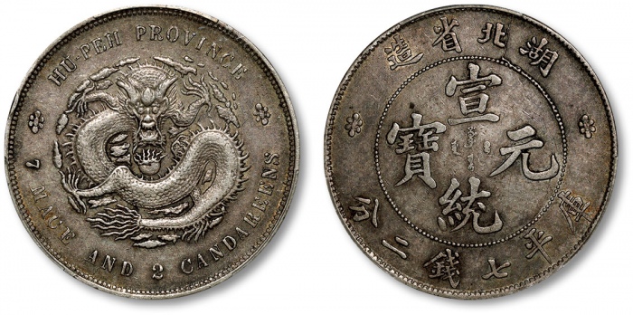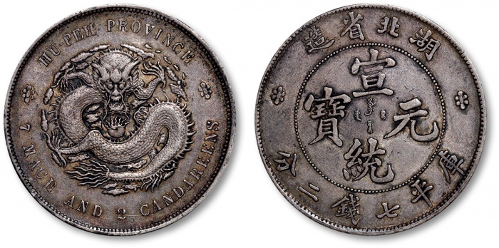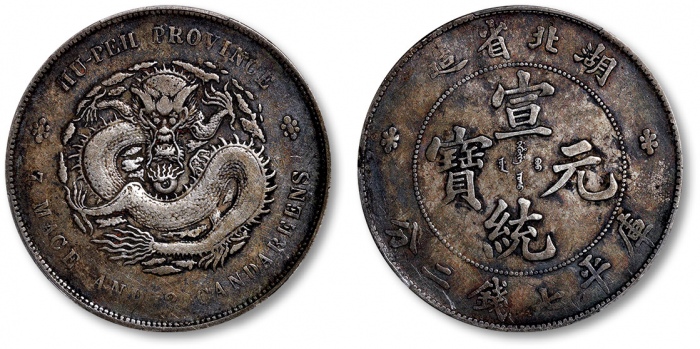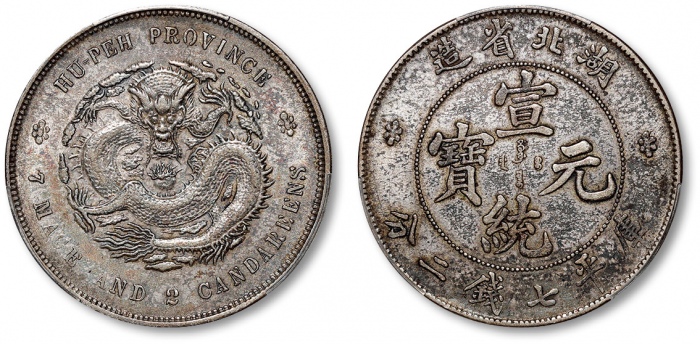 清湖北省造宣统元宝库平七钱二分银币一枚,打制规范,图案清晰立体,灰色老包浆,状态自然,极美至近未使用品