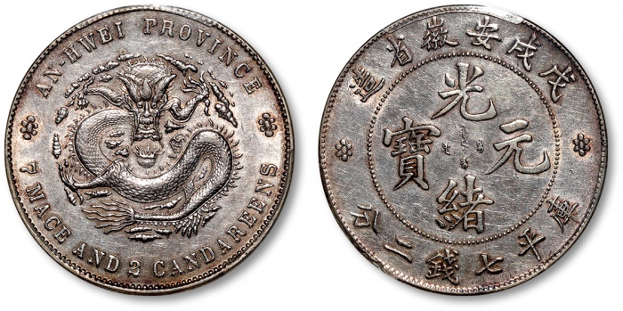 清戊戌安徽省造光绪元宝库平七钱二分银币一枚,打制规范深峻,图案文字立体饱满,淡金色包浆,银光闪亮,金盾PCGS XF Detail(80034705)