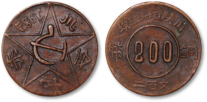 1934年赤化全川·川陕省苏维埃铜币二百文一枚,打制清晰利落,文字图案挺拔饱满,包浆醇厚,极美品