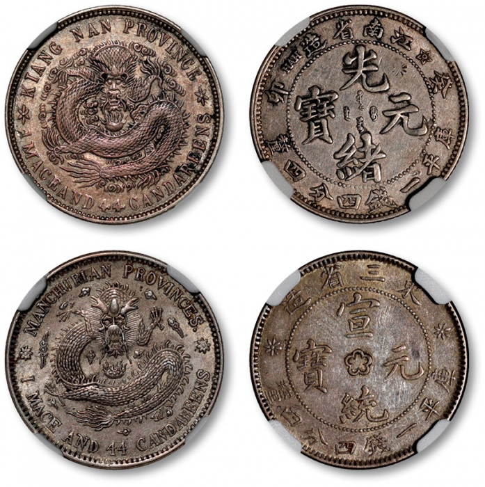 清江南省造“癸卯”光绪元宝库平一钱四分四厘银币一枚、东三省造宣统元宝库平一钱四分四厘银币一枚,共计二枚,打制规范清晰,淡咖啡色包浆,底光柔亮,海外资深藏家出品,均为NGC AU Detail(5787215-166、5787215-164) ...