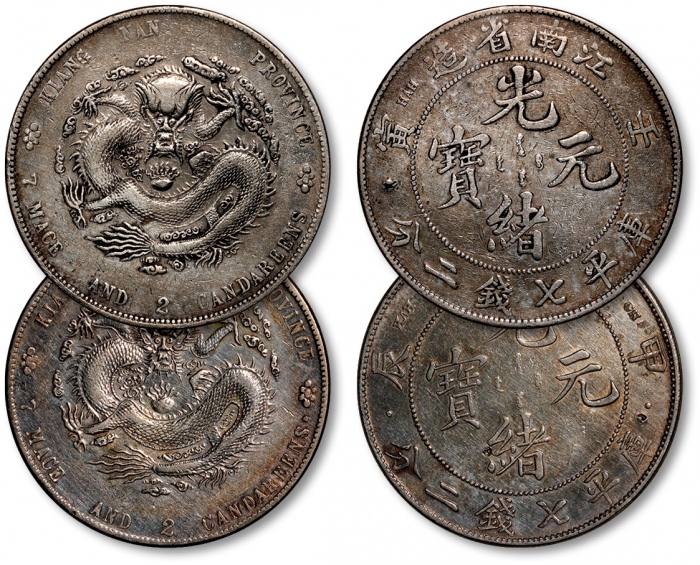 关于 清江南省造“甲辰”、“庚子”光绪元宝库平七钱二分银币共二枚,其中“甲辰”为7前带.版,打制规范,整体清晰,银光亮泽,均为金盾PCGS XF Detail(87144331、80786859)的评论