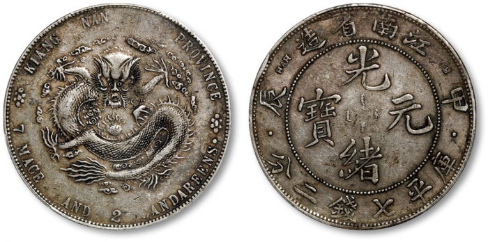 清江南省造“甲辰”光绪元宝库平七钱二分银币一枚,带点版,整体清晰,银光亮泽,极美品