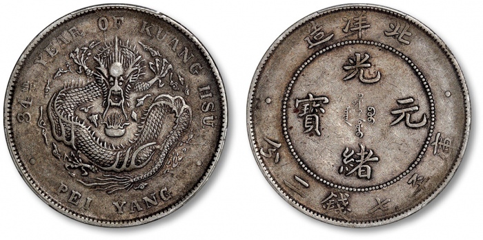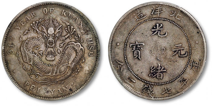 清光绪34年北洋造光绪元宝库平七钱二分银币一枚,整体清晰,灰色老包浆,状态自然,金盾PCGS XF45(88103037)
