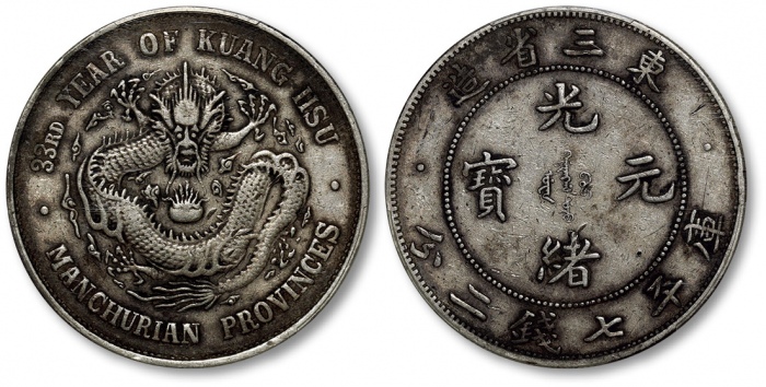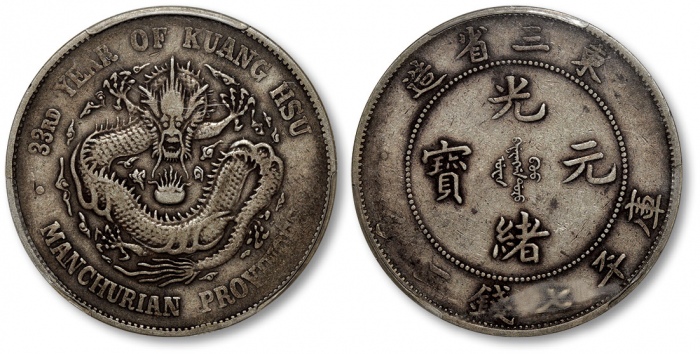 清光绪33年东三省造光绪元宝库平七钱二分银币一枚,图案整体清晰,龙图饱满,原味醇厚灰色老包浆,状态自然舒服,少见之名誉品,有分数者十分难得,金盾PCGS VF30(80174359)