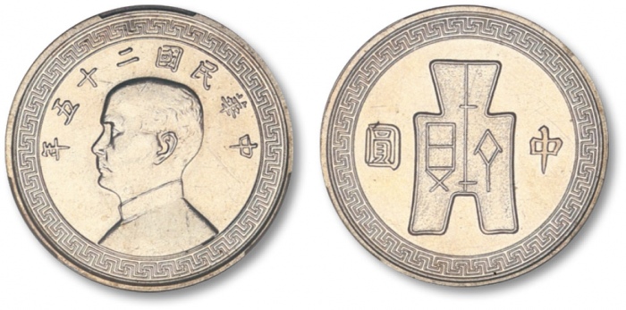 民国二十五年孙中山像背布图中圆银币样币一枚,齿边,此样币设计、铸造极为精美,打制深峻,图案清晰优美,镜面底版,平整光洁,原色银光,银光温润闪耀,柔和悦目,状态顶级,品相一流,存世罕见,十分珍贵,民国人像币名誉品,值得珍视与推重,金盾PCGS SP53(86378565) ...
