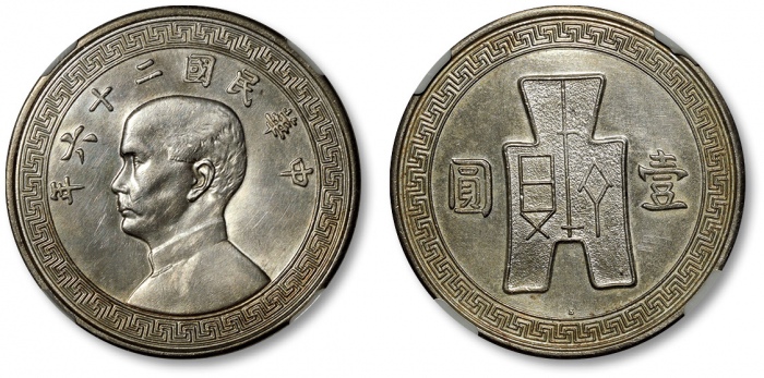 民国二十六年孙中山像背布图壹圆银币样币一枚,齿边,此样币设计、铸造极为精美,打制深峻,图案清晰优美,镜面底版,平整光洁,原色银光,银光温润闪耀,柔和悦目,状态顶级,品相一流,存世极为罕见,极为珍贵,民国人像币大名誉品,值得珍视与推重,海外回流,NGC UNC DETA ...