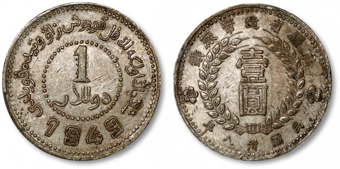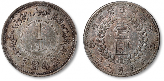 民国三十八年新疆省造币厂铸壹圆银币一枚,方足1版,打制深峻清晰,图文完整精美,银光柔亮,品相状态在同版中出类拔萃,少见,海外资深藏家旧藏,金盾PCGS AU53(42066454),为此公司此品种第一名分数 ...