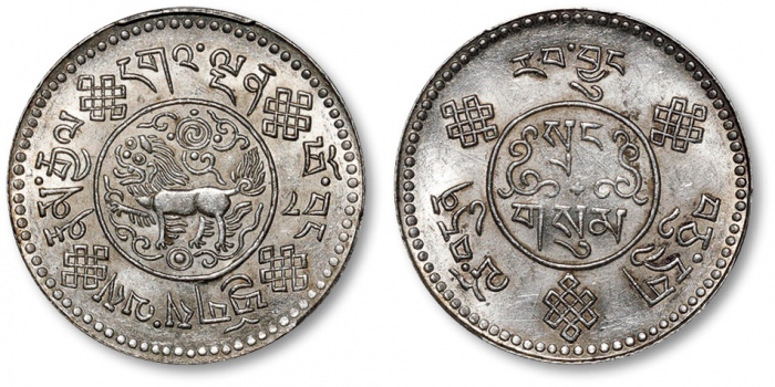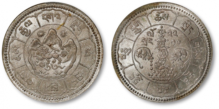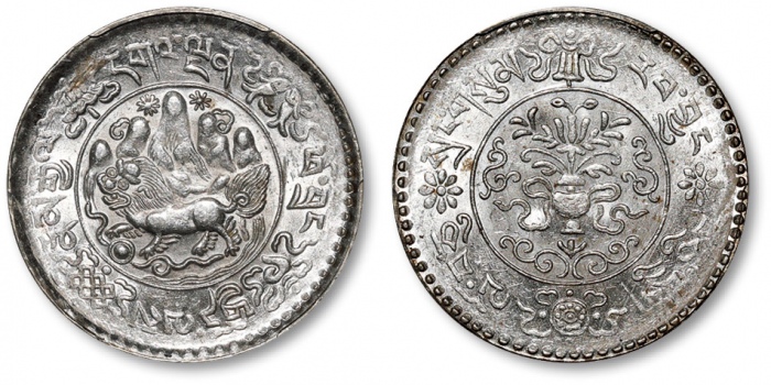 1948年西藏久果“吐宝鼠”10Sr银币一枚,普通版,设计美观,图案寓意吉祥,打制极为清晰规范,图案清晰,细节完整,原味薄纱粉光,均匀丝滑,状态极佳,金盾PCGS MS63(86759685),为此公司此品种第二名分数 ...
