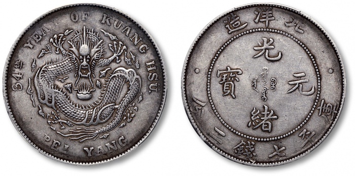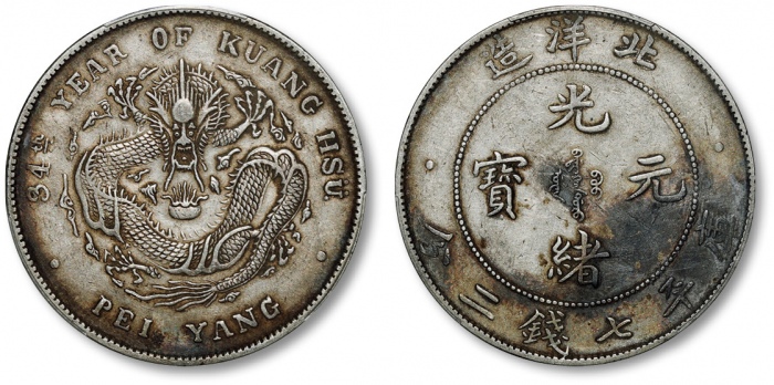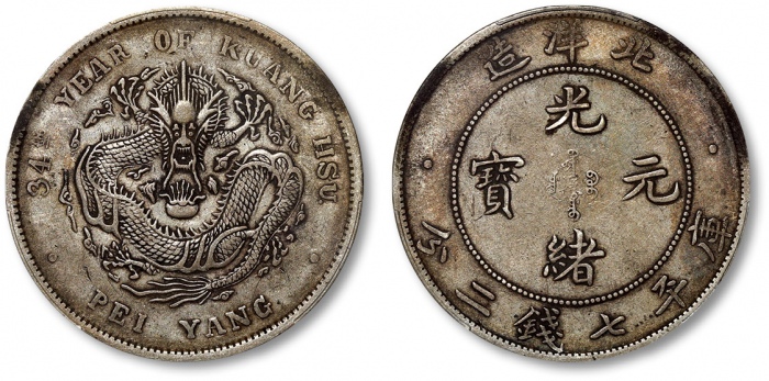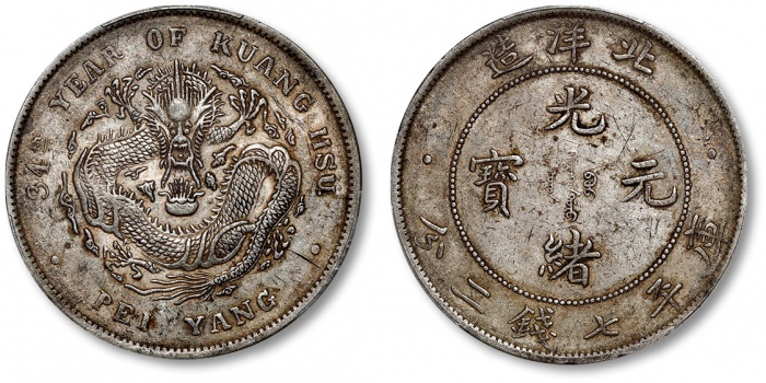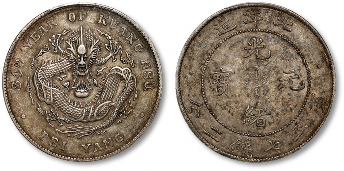 清光绪34年北洋造光绪元宝库平七钱二分银币一枚,整体清晰,金灰色包浆,带底光,状态自然,金盾PCGS XF45(88101875)