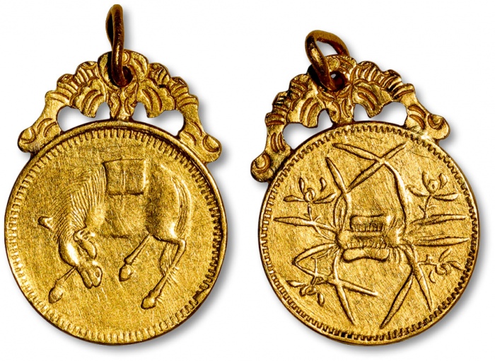民国四川“低首马”背“蟹兰”五文型金制马兰钱一枚带蝙蝠挂,重:16.7g,打制压力十足,图案清晰,金色纯正,目前仅见二枚,十分珍稀吧,极美品
