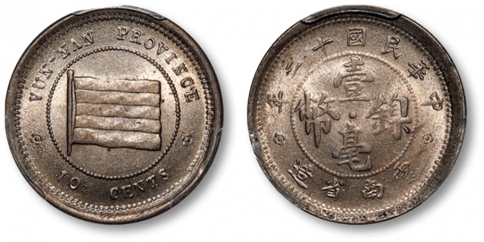 民国十二年云南省造壹毫镍币一枚,打制规范深峻,底版平整光洁,十字旋转光泽,状态上佳,金盾PCGS MS64(86390730)