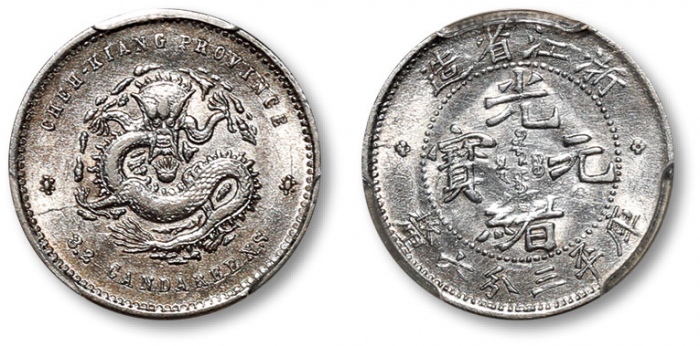 清浙江省造光绪元宝库平三分六厘银币一枚,打制规范,字口图案立体饱满,底版平滑光洁,原色柔亮旋转银光,状态上佳,金盾PCGS AU58(85924783)