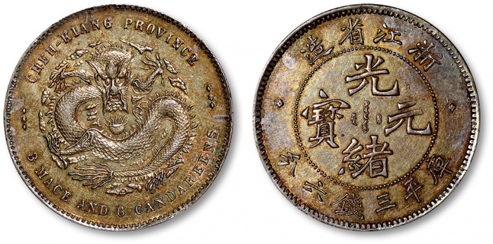 清浙江省造光绪元宝库平三钱六分银币一枚,魏碑体,打制极为深峻规范,文字图案立体饱满,龙鳞峤拔,底版平整,光亮如镜,局部五彩包浆,光泽闪亮,少见,近未使用品