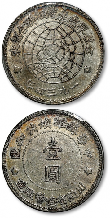 1934年中华苏维埃共和国川陕省造币厂造壹圆银币一枚,小五角星,此币打模极为规范利落,线条立体饱满,底版平滑光洁,细节完美呈现,环形包浆,银光亮丽,罕见之极佳品相状态,十分难得,金盾PCGS AU53(38852632)为此公司此品种仅四枚之第三名分数、更高分仅八枚 ...