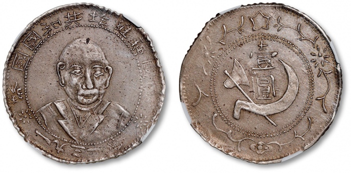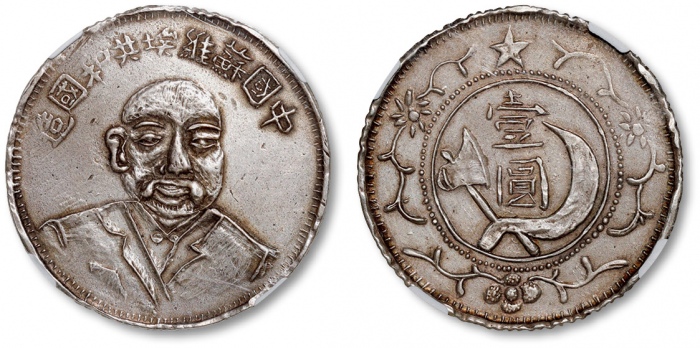 1931年中国苏维埃共和国国币“列宁(马克思)像”壹圆银币一枚,齿边,极为罕见,此币刻模极富时代特色,人像富有神韵,背面镰刀、斧头与壹圆字样立体清晰,深灰色老包浆,状态上佳,NGC AU Detail(6430931-002) ...
