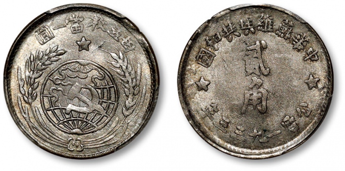 1933年中华苏维埃共和国贰角银币一枚,此币打制深峻,压力均匀十足,文字图案均十分清晰,底版光洁无伤,原味灰色包浆,底光丝滑粉嫩,光泽亮丽,罕见之顶级品相状态,极为难得,金盾PCGS MS63(31782980),为此公司此品种第三名分数且高于此分数仅四枚 ...